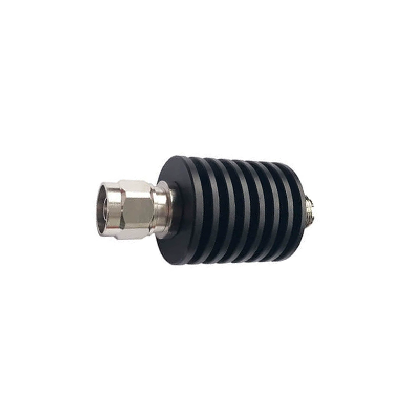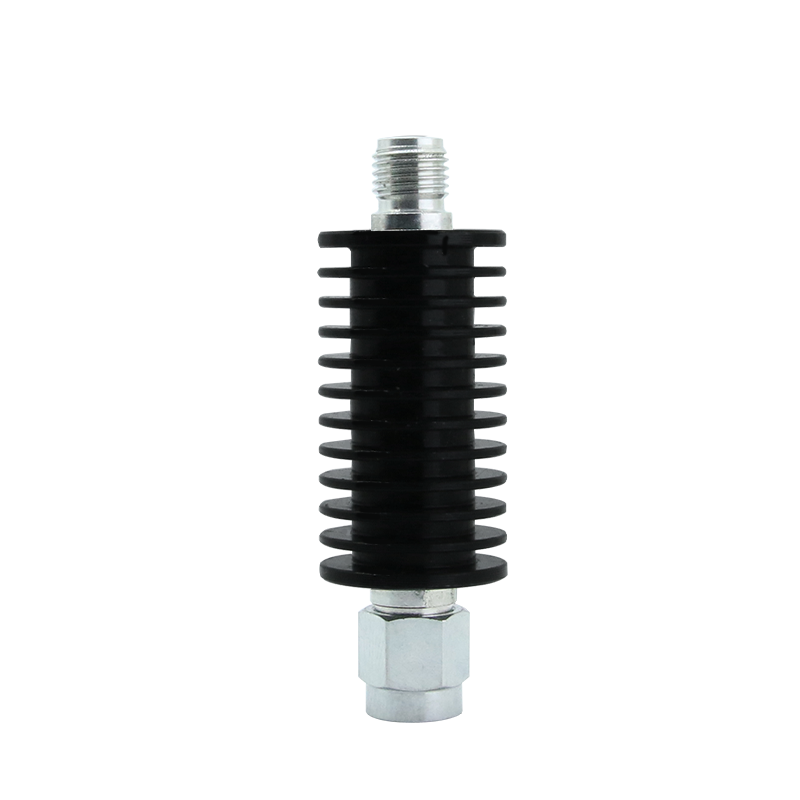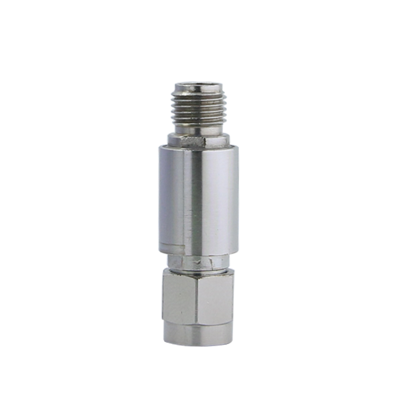 SMA 衰减器 DC-18G 20W | SMAMF-26.5002XX MF表示衰减器 SMA表示连接器 26.5表示工作频率26.5GHz 002表示功率2W XX表示衰减值 | 外导体:黄钢镀镍 内导体:铍铜镀金 绝缘体:PTFE 衰减量:1-10,15,20,25,30,40,50,60dB VSWR≤1.30@18GHz VSWR≤1.20@6GHz |